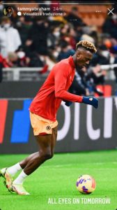 Tammy Abraham è molto carico e vuole rifarsi. Contro il Genoa non è arrivata una prova brillantissima per l’inglese che è entrato anche nell’azione del gol annullato a Zaniolo: suo il pestone su Vasquez. L’attaccante, però, è molto concentrato per la sfida contro l’Inter che vale l’accesso alla semifinale di Coppa Italia. Questa la sua stories Instagram: “Occhi puntati per domani“.