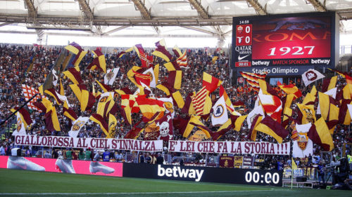 Il derby ha sempre un’atmosfera speciale. I tifosi della Roma, quelli in Curva Sud, hanno organizzato una coreografia che hanno mostrato quando i giocatori sono scesi in campo. Tantissime bandiere giallorosse, gli stemmi storici e soprattutto la scritta: “Giallorossa al ciel s’innalza… È lei che fa la storia“.