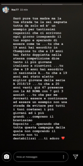 “Sarò pure tua madre ma la tua strada te la sei segnata tutta da solo ed è un esempio per tantissimi ragazzini che ci scrivono ogni giorno inseguendo il tuo sogno e sperando di essere come te… tu che a 19 anni hai esordito in Champions, tu che a 19 anni hai fatto doppietta nella stessa competizione, il più giovane italiano a riuscirci… tu che a 19 anni hai esordito in Nazionale A… tu che a 19 anni sei stato eletto miglior giovane della Serie A 2018/19… tu che a 20 anni vanti già 47 presenze con la AS Roma con 7 gol e 3 assist… tu che per me dovresti essere e continuare ad essere un esempio, non una strada da evitare, per tutti i tuoi coetanei, i più giovani e i più grandi… compreso il bravissimo Esposito… sperando che tutta questa campagna della quale non comprendo il motivo non ti destabilizzi… ti adoro“.