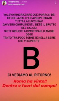 “Volevo ringraziare quei poveracci dei tifosi laziali per avermi rigato tutta la macchina! Davvero complimenti, siete il brutto del calcio. Siete riusciti a dimostrarlo anche oggi! Tanto tra poco tornerete nella serie che vi compete! B. Ci vediamo al ritorno! Roma ha vinto!! Dentro e fuori dal campo!”