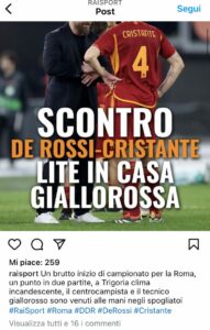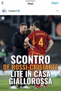 Clamoroso quanto sarebbe successo nello spogliatoio della Roma. Secondo quanto riferito da Rai Sport attraverso un post di Instagram, sarebbe avvenuto uno scontro tra Daniele De Rossi e Bryan Cristante. Addirittura, secondo quanto riferito dall’emittente radiotelevisiva, il tecnico della Roma e il centrocampista sarebbero venuti anche alle mani all’interno degli spogliatoi. Inoltre – sostiene il giornalista della Rai Aurelio Capaldi su X – anche Paredes (molto vicino all’allenatore) sarebbe stato citato nel litigio. Da Trigoria arrivano le smentite: non ci sarebbe stata alcuna lite furiosa, De Rossi e Cristante non sono mai arrivati alle mani. Solo normali discussioni da campo durate pochissimo tempo.