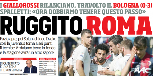 Corriere Dello Sport (G.D’Ubaldo) – La Roma c’è. Nonostante le cadute e le discese ardite riesce sempre a risalire. Messa da parte l’eliminazione dalla Coppa Italia, la squadra di Spalletti rivendica il ruolo di principale candidata al secondo posto e non molla la Juve, che conserva i sei punti di vantaggio. Ma chi si aspettava una Roma tramortita dopo la delusione di martedì si è dovuto ricredere. Il tecnico toscano aveva puntato alla vigilia sui valori morali della sua squadra per rimettersi in carreggiata e il riscatto è avvenuto prontamente. La vittoria al Dall’Ara è stata messa al sicuro già nel primo tempo e la Roma l’ha ottenuta senza soffrire mai, realizzando tre gol che consolidano il primato della squadra italiana più prolifica, con 103 reti complessive. Il Bologna di Donadoni si è arreso presto, vittima degli errori difensivi e non è bastato l’inserimento di Di Francesco a restituire convinzione a una squadra che sembra già in vacanza.