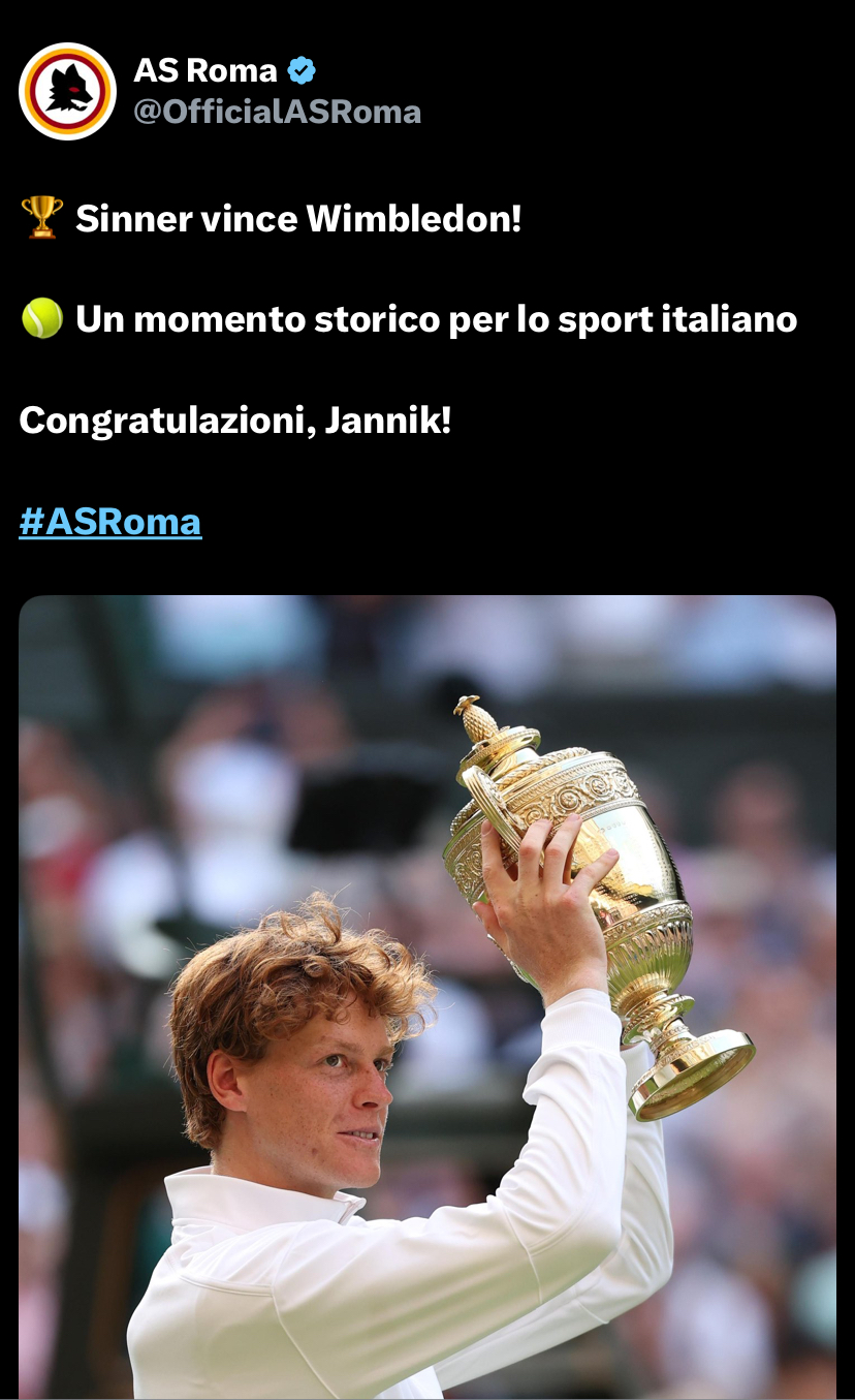 Come riportato sui canali ufficiali del club, l’AS Roma ha voluto omaggiare il tennista con un messaggio chiaro e diretto: “Sinner vince Wimbledon! Un momento storico per lo sport italiano. Congratulazioni, Jannik!”. Un gesto semplice ma significativo, che sottolinea il rispetto e l’ammirazione anche da parte del mondo calcistico per l’impresa del numero uno al mondo.