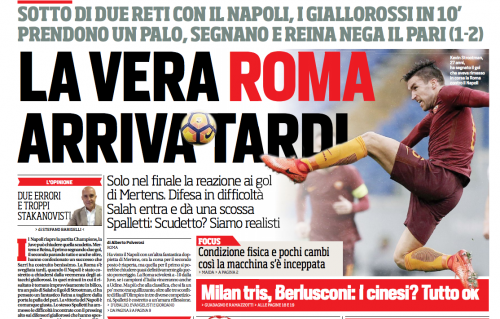 LA TESTA – Il fortino Olimpico è stato scassinato: dopo 16 vittorie di fila in campionato, la Roma ha perso in casa riaprendo una scia di ricordi piuttosto fastidiosi. Dall’arrivo di Spalletti, la squadra ha sbagliato una serie di partite decisive proprio davanti ai propri (pochi) tifosi, che ieri mattina erano andati in mille a spronare i giocatori a Trigoria: 0-2 contro il Real Madrid negli ottavi di Champions League 2015/16, 0-3 contro il Porto nel playoff di agosto, 0-2 nella semifinale-derby, 1-2 nello scontro diretto che avrebbe potuto vidimare con il pennarello indelebile il secondo posto. Evidentemente la Roma sta procedendo nel suo sentiero verso la maturità ma non ha ancora assorbito, nell’anima, la necessaria personalità. Lo ha confermato lo stesso allenatore, denunciando una carenza di coraggio nella scelta delle giocate. In effetti questo atteggiamento, quando le partite non girano nel verso giusto, si nota: la ricerca del passaggio orizzontale che allunga i tempi del possesso palla consentendo all’avversario di sistemarsi, il lancio lungo con preghiera annessa a Dzeko, la scarsa concentrazione difensiva. A tutto questo si devono aggiungere le mosse e i cambi di Spalletti che non hanno convinto né contro la Lazio, né contro il Napoli: succede.