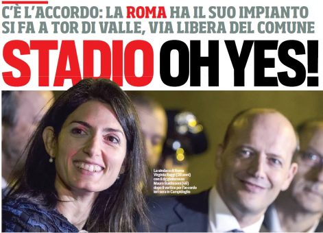 Corriere dello Sport (G.D’Ubaldo – M.Evangelisti) – Ce l’hanno fatta. Dopo quarantotto ore da incubo, lo stadio che ballava, il futuro stesso aggrappato al nulla, le parole del presidente James Pallotta che profetizzavano per la Roma ben che andasse anni di carestia, nel peggiore dei casi il naufragio nella mediocrità. Invece faranno lo stadio e lo faranno a Tor di Valle. Il muro contro muro tra il club e il Movimento 5 Stelle che amministra Roma si è concluso con il più sano dei pareggi. Ma è stata una partita lunga e intensa. Riassunta qui sotto.