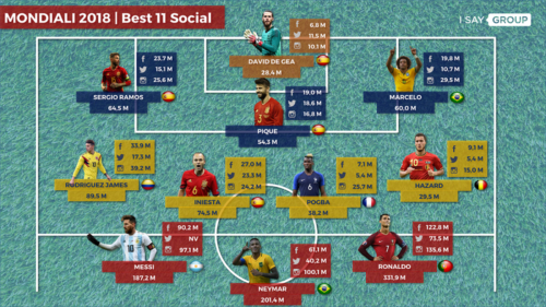 Abbiamo formato il Best 11 dei calciatori con più follower totali sui 3 social, con i dati aggiornati al 16 luglio, data successiva alla finale; si tratta di un valore aggregato che somma i dati di Facebook, Twitter e Instagram, per cui un singolo utente potrebbe seguire un calciatore su un social, ma non su altri. Europa e Sud America si spartiscono con equilibrio i calciatori della formazione con, rispettivamente 6 e 5 calciatori a testa. Spicca il neo-juventino Cristiano Ronaldo, calciatore più seguito al mondo con oltre 331 milioni di fan e grande influencer grazie alle oltre 8 milioni di interazioni su Facebook. Il campione portoghese batte tutti su ogni social network, compreso l’eterno rivale Lionel Messi che si caratterizza per non avere un account Twitter e lascia il secondo posto al brasiliano Neymar. L’asso argentino può vantare comunque la miglior crescita di fan in termini assoluti (oltre 412.000 fan) e il maggior numero di interazioni per post. La nazionale più rappresentata è la Spagna con 4 calciatori (De Gea, Sergio Ramos, Pique e Iniesta). Pogba (Francia) e Hazard (Belgio) sono gli unici 2 calciatori a rappresentare le prime 4 squadre classificate (Francia, Croazia, Belgio, Inghilterra).