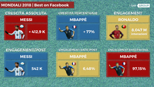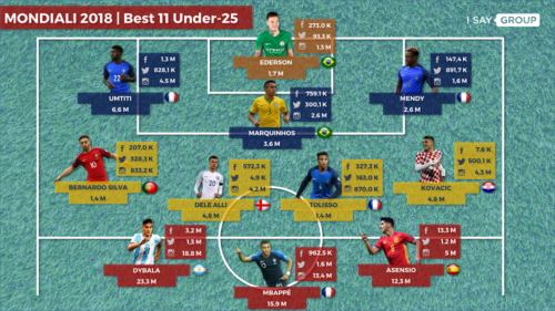 Molto interessante la formazione dei calciatori più seguiti sui social che alla data di inizio del mondiale non avevano compiuto i 25 anni, che identifica gli influencer “emergenti” nel mondo del calcio. Il dato conferma che la Francia ha trionfato grazie al contributo dei suoi giovanissimi campioni: Umtiti, Mendy, Tolisso, ma soprattutto la stella Mbappé che nel corso del Mondiale è stato il calciatore che ha guadagnato la maggior percentuale di fan nel corso dell’evento, crescendo del 77% su Facebook, ma vantando anche il miglior engagement percentuale per post e per pagina, tra tutti i partecipanti. L’argentino Dybala è l’under 25 più seguito in assoluto del mondiale con circa 23,3 milioni di fan.