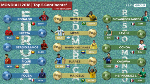 Per quanto riguarda gli altri continenti, dagli ottavi di finale sono stati rappresentati solo Nord America, con il Messico e l’Asia con il Giappone, i cui calciatori più rappresentativi sui social sono rispettivamente Giovani Dos Santos e Kagawa.