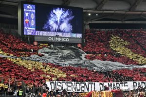 La Curva Sud, durante il derby tra Lazio e Roma valido per la dodicesima giornata di Serie A, ha esposto una coreografia per la stracittadina. “Discendenti di Marte. Padroni della storia” recita lo striscione esposto dal cuore del tifo giallorosso, con il Dio della Guerra e i sette colli romani raffigurati.