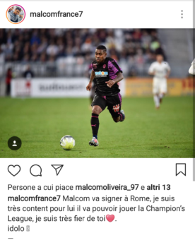 Ormai i social sono una fonte di notizie di mercato. Dopo gli indizi lasciati in giro da Kluivert e Coric ora la testa dei tifosi della Roma è tutta su Malcom. L’attaccante del Bordeaux ha infatti lasciato un like ad un post di un account di un suo fan, che aveva scritto: “Malcom firmerà per la Roma, sono molto contento perché potrà giocare la Champions, sono molto fiero di te mio idolo“. L’esterno brasiliano ieri sera aveva già messo il ‘mi piace’ a due post di Daniel Fuzato, neo portiere giallorosso.