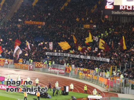 Ore 20.41 – Finisce lo “sciopero” della curva. Cori contro Pallotta e un nuovo striscione nel curvino:Â “Noi ti amiamo e sosteniamo, rispetto meritiamo“.