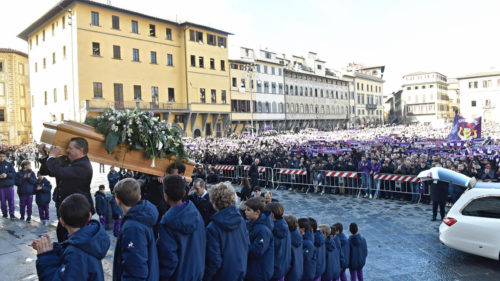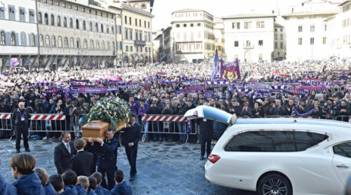 Pagine Romaniste (S.Burioni) – Dopo l’affetto e la grande commozione manifestate dalla gente alla camera ardente, riceve oggi gli elogi funebri nella Basilica di Santa Croce a Firenze Davide Astori, scomparso nella notte fra sabato 3 e domenica 4 marzo. Oltre a dirigenti, calciatori e staff della Fiorentina, presenti molti tifosi e rappresentanti di società di calcio. Tutti nella città viola per stringersi attorno alla famiglia del difensore. Da Roma sono partiti Totti, De Rossi, Florenzi, Pellegrini, Nainggolan, Bruno Conti e Balzaretti.