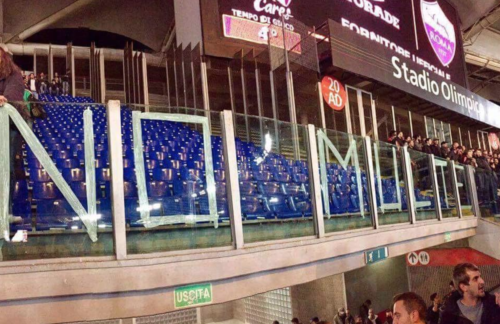Ore 20:40 – Le squadre entrano in campo. Al centro del terreno di gioco viene esposto uno striscione: “#ioleggoperché“. Viene letta una pagina del diario di Anna Frank. I Fedayn hanno disertato gli spalti per i primi minuti. “No multe“, la scritta sul loro muretto.