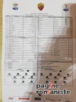 AS ROMA (4-3-3): Alisson; Florenzi, Manolas (78′ Hector Moreno), Fazio, Kolarov; Nainggolan (74′ Gerson), De Rossi, Pellegrini; Cengiz Under (74′ Schick), Dzeko, El Shaarawy.