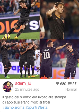 Adem Ljajic, tramite una foto su Instagram, ha spiegato la sua esultanza polemica, dopo il gol realizzato nella vittoria contro il Torino: “Il gesto del silenzio era rivolto alla stampa, gli applausi erano rivolti ai tifosi #siamolaroma #3punti #festa“.