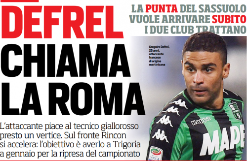 Corriere Dello Sport (G.D’Ubaldo) – La Roma e il mercato che verrà. Oltre a Rincon, praticamente preso, il club giallorosso sta cercando un attaccante che possa essere una valida alternativa a Salah. Gregoire Defrel da tempo è uno dei profili preferiti da Luciano Spalletti, che lo segue dai tempi in cui giocava al Cesena (nella stagione 2014-15, quando l’attaccante segnò 9 reti in trentaquattro partite) ed è rimasto favorevolmente colpito dalla prestazione che ha fatto contro la Roma nella partita giocata a Reggio Emilia alla fine di ottobre. Roma e Sassuolo hanno avuto un paio di incontri negli ultimi mesi per parlare di varie situazioni, non solo quella di Defrel. I direttori sportivi si aggiorneranno durante le feste di Natale, dopo l’ultima partita di campionato, in programma giovedì. Al momento opportuno le parti si rivedranno e anche il giocatore esprimerà il suo parere. Il francese, che in questo campionato ha messo insieme quindici presenze (quattordici da titolare) e sei gol, si sente pronto per tentare l’avventura in un grande club, la soluzione della Roma lo affascina, avrebbe probabilmente l’opportunità di giocare in Champions. L’attaccante e il suo procuratore Giampaolo Pocetta hanno in programma un incontro con i dirigenti del Sassuolo nei prossimi giorni, dopo la partita contro il Cagliari e porteranno le offerte che sono arrivate per il giocatore. La Roma è fortemente interessata e può costruire un’operazione molto simile a quella messa a punto con il Genoa per Rincon: prestito oneroso con obbligo di riscatto. Il Sassuolo ha sempre detto di non voler cedere l’attaccante, ma alla luce della piega che sta prendendo la stagione dovranno essere prese alcune decisioni strategiche per il futuro. Il Sassuolo è stato ridimensionato dagli infortuni, è uscito dall’Europa League, in campionato è posizionato nelle retrovie. Ma non corre rischi di retrocessione. Di Francesco stima tantissimo Defrel e non vorrebbe cederlo, ma il Sassuolo deve recuperare Berardi, che in questa stagione è mancato tantissimo.