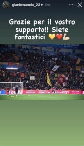 La Roma vince in trasferta contro il Sassuolo per 1-2. I giallorossi raggiungono il quarto posto in classifica a quota 24 punti. Gianluca Mancini ha ringraziato tutti i tifosi giallorossi presenti al Mapei Stadium tramite una storia sul suo profilo Instagram: