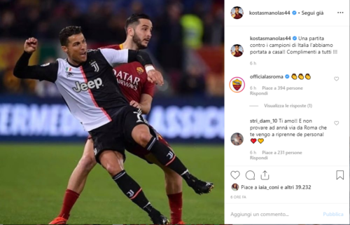 Battere la Juve, anche se appagata, non è mai un’impresa facile. Kostas Manolas ha voluto complimentarsi con i suoi compagni di squadra attraverso il suo profilo Instagram: “Abbiamo portato a casa una partita contro i campioni d’Italia. Complimenti a tutti!”.