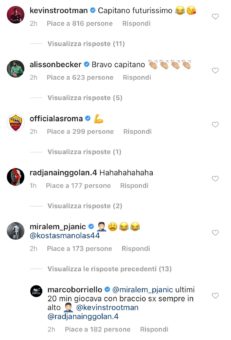 Il greco, però, è stato subito preso in giro da alcuni compagni ed ex compagni: “Capitan futurissimo” scrive Kevin Strootman, mentre tra il serio ed il faceto commenta Alisson: “Bravo capitano“. Miralem Pjanic, invece, si è limitato ad uno smile sorridente, mentre Marco Borriello, oggi alla SPAL ma assente per infortunio, ha commentato: “Gli ultimi 20 minuti giocava sempre col braccio sinistro in alto“.