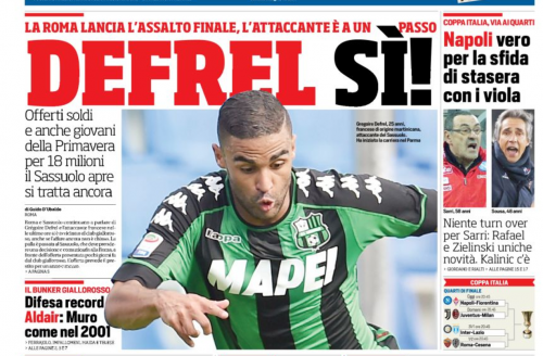 “Defrel sì!“. E’ questo il titolo dell’edizione romana del Corriere dello Sport sulla trattativa che riguarda l’attaccante francese, cercato con insistenza dalla Roma. Questo il resto dei dettagli forniti dal quotidiano sportivo: “La Roma lancia l’assalto finale, l’attaccante è a un passo. Offerti soldi e anche giovani della Primavera per 18 milioni. Il Sassuolo apre, si tratta ancora“.