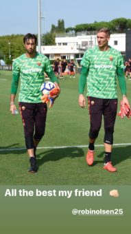 Finisce, almeno momentaneamente l’avventura romanista di Robin Olsen. Il portiere si è trasferito in prestito al Cagliari e il suo collega, Antonio Mirante, ha voluto salutarlo con un post su Instagram, scrivendo: “Ti auguro il meglio amico mio“.