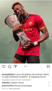 La Roma termina la sua stagione con la vittoria della Conference League, ma il pensiero è già al prossimo anno. Tammy Abraham ha pubblicato su Instagram alcuni scatti con il trofeo vinto a Tirana scrivendo: “Sono arrivato. Ci abbiamo creduto. Abbiamo raggiunto il risultato. La storia è fatta! Campioni europei!!! Daje Romaaa“. Commenta José Mourinho: “Manca l’Europa League…“. La risposta dell’attaccante inglese non si è fatta aspettare: “È la prossima mister!“.