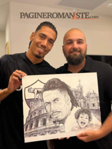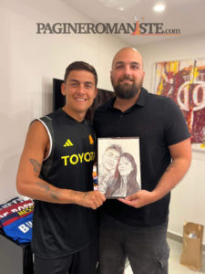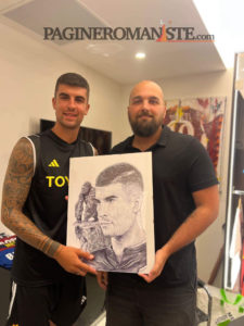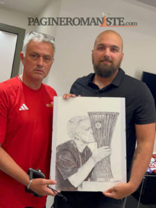 Il disegnatore Riccardo Fascetti, in arte Done Art, oggi ha avuto l’opportunità di recarsi al centro sportivo Fulvio Bernardini per regalare dei quadri a Josè Mourinho e calciatori. L’artista tifosissimo della Roma, disegna sin da quando era bambino e oggi ha avuto l’opportunità di esaudire un sogno nel cassetto. Negli scatti dell’artista spiccano le nuove divise da allenamento di staff tecnico e giocatori. Il colore nero prevale, mentre il simbolo Adidas e lo sponsor Toyota sono in giallo fluo. Immancabile il lupetto di Gratton (presente anche nella prima maglia ufficiale) sui colori dell’arancione.