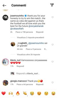 La Roma si qualifica direttamente agli ottavi di Conference League e il merito non è solo il suo. I giallorossi, infatti, hanno battuto per 3-2 il CSKA Sofia ma questo risultato non sarebbe stato sufficiente se lo Zorya non avesse fermato il Bodo-Glimt sul punteggio di 1-1. Josè Mourinho ha voluto ringraziare proprio la società ucraina sotto un post di Instagram. Queste le parole del portoghese: “Grazie per l’onestà con cui avete provato a vincere il match…lo stesso che ha fatto il CSKA contro di noi. Questo è il calcio che tutti noi amiamo. Vi auguro il meglio per il futuro”.