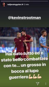 Radja Nainggolan, centrocampista dell’Inter ed ex calciatore della Roma, ha voluto salutare il proprio ex compagno Kevin Strootman attraverso una storia pubblicata sul proprio account di Instagram. Queste le sue parole: