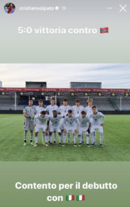 Cristian Volpato ha scelto di vestire la maglia della Nazionale Italiana e oggi ha messo a segno la sua prima presenza con gli azzurri Under 20. Il giovane giallorosso è partito titolare, giocando 60 minuti e ottenendo anche la prima vittoria. L’Italia ha infatti battuto la Norvegia per 5-0. Grande soddisfazione per il classe 2003 che ha commentato la vittoria con una storia su Instagram: “5-0 contro la Norvegia, contento per il debutto con l’Italia”.
