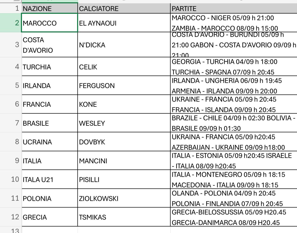 Europa al centro. Celik difenderà i colori della Turchia contro Georgia (4 settembre, ore 18:00) e Spagna (7 settembre, ore 20:45). In Irlanda fari puntati su Ferguson, che affronterà Ungheria (6 settembre, ore 19:45) e Armenia (9 settembre, ore 20:00). La Francia convoca Koné, atteso dal doppio test di lusso: Ucraina (5 settembre, ore 20:45) e Islanda (9 settembre, ore 20:45).