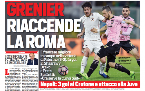 Corriere dello Sport (G.D’Ubaldo) – La Roma può tirare un sospiro di sollievo, da oggi può concentrarsi sul ritorno contro il Lione con il morale risollevato e con la speranza di aver superato la crisi. Ma il 3-0 nasconde le difficoltà che la squadra di Spalletti ha incontrato in questa partita, soprattutto all’inizio della ripresa, quando con il solito calo degli ultimi tempi ha sofferto la reazione del Palermo. La squadra di Lopez ha dimostrato di essere viva, ha avuto la possibilità di arrivare a meno quattro dall’Empoli, ma non ha avuto la forza di sfruttare le debolezze attuali della Roma. I giallorossi hanno vinto la quinta partita in trasferta nelle ultime sei, hanno mantenuto il vantaggio nei confronti di Napoli e Inter. Ci vorrà qualcosa in più di quanto visto ieri per centrare l’impresa in Europa League, ma la sorpresa della serata siciliana è stata rappresentata da Grenier, che ha dimostrato di avere grandi qualità nella sua gara di esordio da titolare in giallorosso. Assist, recuperi difensivi, si è inserito alla grande.