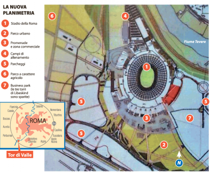 La Repubblica (L.D’Albergo) – «Sono arrivati con il contagocce – scherzavano qualche giorno fa i vertici del Campidoglio – ma alla fine abbiamo ricevuto tutto». Tra i documenti che sono stati inviati al dipartimento Urbanistica del Comune da Eurnova, la società che punta a realizzare il nuovo stadio della Roma, c’è anche la nuova planimetria di cui Repubblica è in possesso. Finita tra le carte del dossier più caldo per l’amministrazione Raggi, la piantina del progetto bis mette subito in evidenza l’assenza delle tre torri di Daniel Libeskind. È questa la grande novità: con il taglio del 50 per cento delle cubature, i grattacieli sono spariti. Nel business park che affiancherà la nuova arena giallorossa si conteranno allora 18 palazzine alte al massimo sette piani. La planimetria – che potrebbe però subire ancora ulteriori modifiche – rivela anche l’addio al ponte dello Stadio. Non se ne fa menzione neanche nelle linee guida approvate in giunta: nell’atto con cui ieri il Comune a trazione grillina ha ribadito l’interesse alla realizzazione del progetto dello stadio appare solo il ponte dei Congressi. La delibera, in attesa del nuovo progetto, è una lettera d’intenti. Che lascia, peraltro, senza risposta più di un interrogativo. Nella lista dei desiderata, ad esempio, alla voce trasporti sono spariti i 10 milioni per la ristrutturazione della fermata Tor di Valle. E della ferrovia Roma-Lido si tratta non più in termini di treni, ma di passeggeri l’ora: difficile, per ora, determinare il numero esatto di convogli nuovi o da rimettere in sesto attraverso un revamping della vecchia flotta.