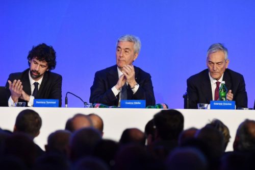THE END – L’ultimo pasticcio di una giornata scandita da trattative continue per le poltrone, accuse incrociate, riunioni fiume in stanze segrete, tripli salti mortali, in sostanza il meglio del peggio cui ci ha abituato il calcio italiano che ieri ha lasciato basiti anche i delegati di Fifa e Uefa, si consuma quando l’ennesimo accordo tra i due candidati rimasti, costretti loro malgrado a scendere a patti per evitare l’invasione del Coni e tenere in piedi la baracca, salta. La convergenza della Dilettanti su Gabriele Gravina presidente sfuma sul più bello (si fa per dire), lasciando tutti di stucco, compreso il povero presidente dell’assemblea, il magistrato di lunghissimo corso Pasquale De Lise, che pochi istanti prima ha annunciato dal palco l’arrivo di Cosimo Sibilia per un’importante comunicazione e a quel punto non sa più che pesci pigliare. La comunicazione effettivamente arriva, ma è di tutt’altro tenore, e questa davvero toglie il fiato ai presenti. «La nostra disponibilità a eleggere Gravina presidente, messa sul tavolo mostrando ancora una volta grande senso di responsabilità, con l’obiettivo di dare al governo del calcio quell’ampia maggioranza di cui avrebbe avuto bisogno, è stata incredibilmente rifiutata, a questo punto la Lnd vota scheda bianca». È la certificazione di un fallimento e una dimostrazione di impotenza. Siamo alla quarta votazione, l’ultima concessa dallo Statuto per eleggere un presidente: «basterebbe» il 50% più uno dei voti validamente espressi, ma con la Dilettanti (34%) e i Calciatori (20%) intenzionati a votare bianca, l’elezione di Gravina diventa aritmeticamente impossibile.