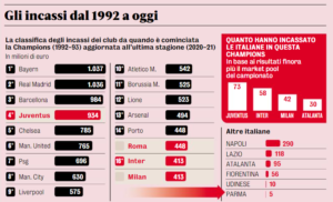 Nell’edizione 2017-18, quella della semifinale persa contro il Liverpool dopo l’impresa con il Barcellona, i ricavi sono arrivati a 100 milioni. Nell’ultima, invece, quella successiva, la Roma ha incassato 57,6 milioni.