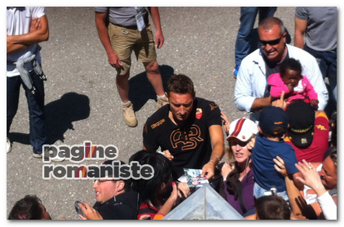 Al termine della seduta mattutina Francesco Totti si è concesso all’abbraccio dei tifosi giallorossi. Il capitano si è fermato per firmare autografi e farsi scattare alcune foto dai sostenitori presenti nel ritiro di Riscone.