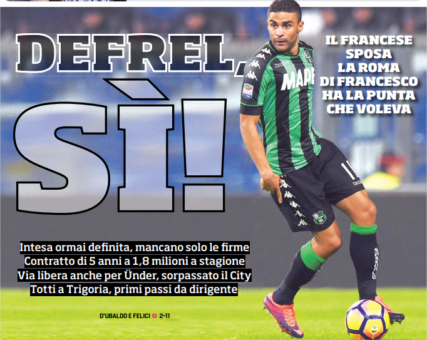 Corriere Dello Sport (G.D’Ubaldo) – Il mercato tiene banco anche tra le montagne della Val Rendena. Monchi è ripartito per accontentare Di Francesco, che ha chiesto cinque rinforzi, specificando anche i ruoli. La priorità è per l’esterno d’attacco di destra, per il quale il direttore sportivo spagnolo ha due tavoli aperti, anzi apertissimi. Uno riguarda Gregoire Defrel, l’altro il giovanissimo Cengiz Ünder, venti anni da compiere domani. Due giocatori per lo stesso ruolo, anche se il francese è un attaccante polivalente e può fare anche il centravanti.
