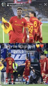 A poche ore dall’inizio di Lazio–Roma, cresce sempre di più la tensione pre derby, anche tra chi, questa partita non la potrà giocare. Tra gli assenti c’è infatti Tammy Abraham che ha voluto incitare con una storia Instagram i suoi compagni di squadra. “Il giorno del derby. Forza ragazzi“. Queste le parole dell’attaccante inglese accompagnate da due foto risalenti al 20 marzo 2022, data in cui i giallorossi vinsero il loro ultimo derby grazie anche ad una doppietta dell’ex Chelsea.