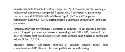 “Su richiesta della Consob, Friedkin Gropu Inc. (“TFG) conferma che, come già indicato nel comunicato stampa del 7 agosto u.s., il corrispettivo pattuito per l’acquistizione dell’86,6% della AS Roma S.p.A. (la “Società”) è pari a complessivi Euro 63.414.047, corrispondenti a un prezzo unitario di 0,1165 Euro per azione. Pertanto, una volta perfezionato il contratto di acquisto – il cui closing è previsto per il 17 agosto p.v. – sarà promossa ai sensi degli artt. 102 e 106, comma 1, del TUF un’offerta pubblica di acquisto sull’intero capitale della Società al prezzo per azione di Euro 0,1165. Maggiori dettagli sull’offerta pubblica di acquisto saranno forniti nella comunicazione dell’offerente che verrà pubblicata dopo il closing”.