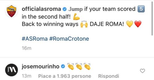Una vittoria fondamentale in vista della prossima stagione. Così, infatti, la Roma sarebbe in Conference League. E proprio l’allenatore della prossima annata calcistica si è congratulato con la squadra. Sotto al post Instagram del profilo della Roma, José Mourinho ha applaudito la prestazione della squadra.