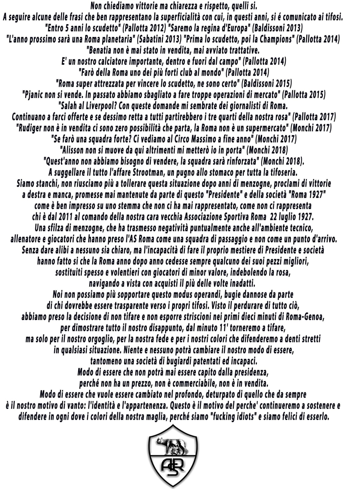 “Non chiediamo vittorie ma chiarezza e rispetto, quelli sì. A seguire alcune delle frasi che ben rappresentano la superficialità con cui, in questi anni, si è comunicato ai tifosi. “Entro 5 anni lo scudetto” (Pallotta 2012). “Saremo la regina d’Europa” (Baldissoni 2013). “L’anno prossimo sarà una Roma planetaria” (Sabatini 2013). “Prima lo scudetto, poi la Champions” (Pallotta 2014). “Benatia non è mai stato in vendita, mai avviato trattative. È un nostro calciatore importante, dentro e fuori dal campo” (Pallotta 2014). “Farò della Roma uno dei più forti club al mondo” (Pallotta 2014). “Roma super attrezzata per vincere lo scudetto, ne sono certo” (Baldissoni 2014). “Pjanic non si vende. In passato abbiamo sbagliato a fare troppe operazioni di mercato” (Pallotta 2015). “Salah al Liverpool? Con queste domande mi sembrate dei giornalisti di Roma. Continuano a farci offerte e se dessimo retta a tutti partirebbero i tre quarti della nostra rosa” (Pallotta 2017). “Rudiger non è in vendita, ci sono zero possibilità che parta, la Roma non è un supermercato” (Monchi 2017). “Se farò una squadra forte? Ci vediamo al Circo Massimo a fine anno” (Monchi 2017). “Alisson non si muove da qui altrimenti mi metterò io in porta” (Monchi 2018). “Quest’anno non abbiamo bisogno di vendere, la squadra sarà rinforzata” (Monchi 2018). A suggellare tutto l’affare Strootman, un pugno allo stomaco per tutta la tifoseria. Siamo stanchi, non riusciamo più a tollerare questa situazione dopo anni di menzogne, proclami di vittorie a destra e manca, promesse mai mantenute da parte di questo “Presidente” e della società “Roma 1927” come è ben impresso su uno stemma che non ci ha mai rappresentato, come non ci rappresenta chi è dal 2011 al comando della nostra vecchia cara Associazione Sportiva Roma 22 luglio 1927. Una sfilza di menzogne, che ha trasmesso negatività puntualmente anche all’ambiente tecnico, allenatore e giocatori che hanno preso l’AS Roma come una squadra di passaggio e non come un punto d’arrivo. Senza dare alibi a nessuno sia chiaro, ma l’incapacità di fare il proprio mestiere di Presidente e società hanno fatto sì che la Roma anno dopo anno cedesse sempre qualcuno dei suoi pezzi migliori, sostituiti spesso e volentieri con giocatori di minor valore, indebolendo la rosa, navigando a vista con acquisti il più delle volte inadatti. Noi non possiamo più sopportare questo modus operandi, bugie dannose da parte di chi dovrebbe essere trasparente verso i propri tifosi. Visto il perdurare di tutto ciò, abbiamo preso la decisione di non tifare e non esporre striscioni nei primi dieci minuti di Roma-Genoa, per dimostrare tutto il nostro disappunto. Dal minuto 11 torneremo a tifare, ma solo per il nostro orgoglio, per la nostra fede e per i nostri colori che difenderemo a denti stretti in qualsiasi situazione. Niente e nessuno potrà cambiare il nostro modo di essere, tantomeno una società di bugiardi patentati e incapaci. Modo di essere che non potrà mai essere capito dalla presidenza, perché non ha un prezzo, non è commerciabile, non è in vendita. Modo di essere che vuole essere cambiato nel profondo, deturpato di quello che da sempre è il nostro motivo di vanto: l’identità e l’appartenenza. Questo è il motivo del perché continueremo a sostenere e difendere in ogni dove i colori della nostra maglia, perché siamo “fucking idiots” e siamo felici di esserlo“.