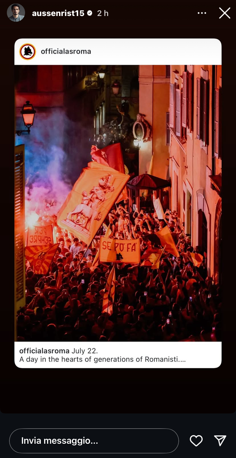 Durante la spettacolare celebrazione andata in scena ieri sera, con un corteo coloratissimo partito da Piazza Navona e animato da cori, fumogeni e bandiere, anche Hummels ha partecipato, a modo suo, alla festa. Sul suo profilo Instagram ha pubblicato una foto dell’evento, un pensiero affettuoso per la Roma e i suoi tifosi.