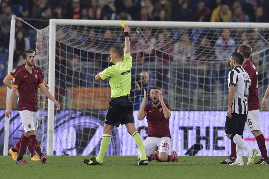 Da lì in avanti Orsato decide di usare le cattive. Il primo cartellino giallo arriva al 19’, destinatario Torosidis per un fallo su Evra. Corrette anche le ammonizioni per i falli di De Rossi (su Morata) ed Evra (su Torosidis). Nella ripresa Orsato punisce con il giallo Morata (fallo su Yanga-Mbiwa), Pjanic (su Pereyra), Yanga-Mbiwa (intervento scomposto su Morata) e al 17’ ammonisce per la seconda volta Torosidis: il greco aggancia Vidal in modo involontario, ma il cileno è lanciato a rete, dunque la decisione è corretta. Orsato non cambia il metro nel finale: giusto ammonire Marchisio, Chiellini, Nainggolan e al 39’ Vidal, che però meritava il giallo al 31’ per un fallo su Iturbe . Corretta anche la decisione di non assegnare il rigore chiesto da Keita: il maliano tira per primo la maglia a Caceres che poi gli cade addosso.