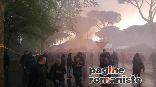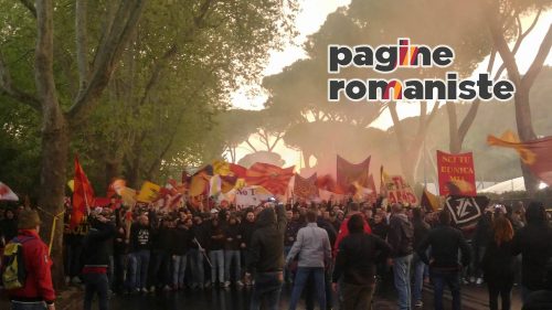 Ore 18.35 – Inizia il corteo dei tifosi romanisti che si fermerà al Bar River. Tanti cori da parte del popolo della Roma.