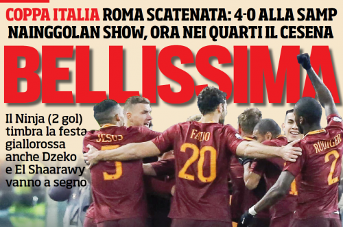 Corriere dello Sport (A.Polverosi) – Quattro gol, tutti del trio d’attacco, Nainggolan (due, apertura e chiusura), Dzeko ed El Shaarawy, quattro a zero alla Samp, ora per la Roma la semifinale di Coppa Italia (contro l’Inter o la Lazio?) è vicina, in mezzo c’è un ostacolo di Serie B, il Cesena, e se la Roma è quella di ieri sera sarà molto difficile per i romagnoli anche solo pensare all’impresa. Ha giocato da squadra sicura, senza alzare mai il tono della sfida: non ne ha avuto bisogno per imporre il suo marchio. Ha attaccato sugli esterni e ha sfruttato gli errori della difesa doriana, totalmente fuori fase a cominciare da Silvestre. Ha corso un solo vero pericolo, il palo di Muriel dopo 3 minuti, negli altri 90 (recupero compreso) non ha mai messo in discussione non solo il risultato, ma nemmeno la sua superiorità tecnica. Pratica, attenta, solida, a queste qualità la Roma ha aggiunto quattro gol spettacolari che hanno dato un bel colore alla sua partita. Poca Samp, troppo poca per mettere in apprensione la Roma in serate del genere.