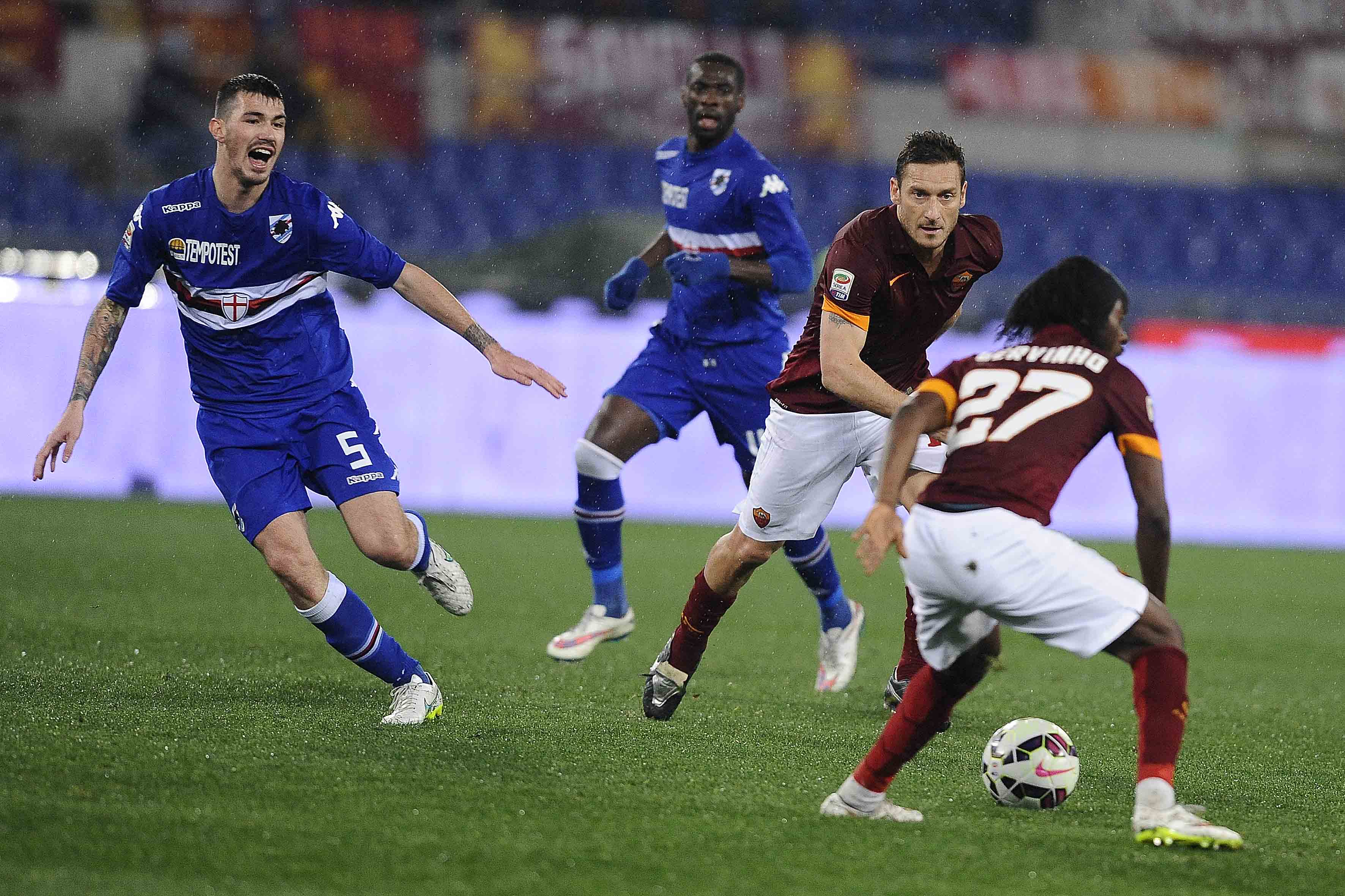 Eto’o è l’uomo che condiziona tutto. Le due squadre si affrontano a specchio, con il modulo 4-3-3, ma con modalità differenti: la Roma pressa alta sulla difesa, non lascia impostare il gioco con semplicità, così Viviano cerca spesso il lancio lungo (15 volte lo fa in maniera positiva), verso il fisicone di Okaka. I giallorossi dominano il possesso palla, superando il 60 per cento, e il vantaggio territoriale, con il 62 per cento. Gli uomini di Garcia tirano 14 volte, calciano 12 volte dall’angolo, effettuano 32 cross. Mihajlovic piazza i suoi con baricentro basso, lascia il giropalla semplice ai difensori (Yanga-Mbiwa e Astori superano i 50 passaggi positivi), ma impedisce che il gioco fluisca a centrocampo: Soriano, insieme a Okaka, pressa su Keita, il faro che comunque fa scorrere il pallone ben 74 volte. Palombo ringhia altissimo su Pjanic. Resta un buco davanti alla difesablucerchiata, quello in cui Totti si presenta per inventare. Lì Mihajlovic manda Silvestre in avanscoperta. Non funziona sempre, nel primo tempo Totti esprime lampi di classe ma alla fine crea una sola occasione da rete. Viviano fa sì che la tattica preparata a tavolino riesca, la Romainfatti conclude nello specchio ben 9 volte, record in questo campionato, 5 soltanto nel primo tempo. Totti è preciso 3 volte ma non batte Viviano. La Sampdoria lo fa soltanto 2 volte e non sbaglia mai. Regini intercetta il pallone 5 volte, uno lo rilancia e avvia l’azione che porterà al 2-0.