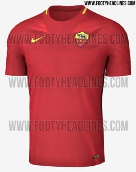 Dopo diverse anteprime il sito FootyHeadlines ha svelato la prima maglia della Roma per la stagione 2017/18. La vera novità del completo dei capitolini è il ritorno ai colori della tradizione: come annunciato in un precedente comunicato saranno utilizzati il rosso e il giallo della città di Roma sia per la maglia che per lo stemma. La casacca prevede una striscia gialla intorno al collo, mentre le maniche sono leggermente più scure alla base, con una striscia nera che corre sui fianchi. Il kit sarà completato dai pantaloncini rossi e dai calzini neri.