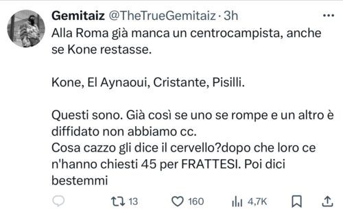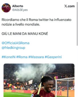 Su X il malumore corre veloce. “Sarà peggio di Pjanic alla Juve. Friedkin senza ambizioni”, scrive un utente. E non è l’unico: anche il rapper Gemitaiz attacca la scelta della società. “Alla Roma manca già un centrocampista, anche se Koné restasse. Come si può pensare di venderlo dopo che l’Inter ci ha chiesto 45 milioni per Frattesi?”.