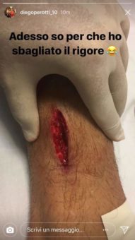Perotti ha scherzato su Instagram, dove ha postato una foto del trauma, accompagnando lo scatto con una frase ironica: