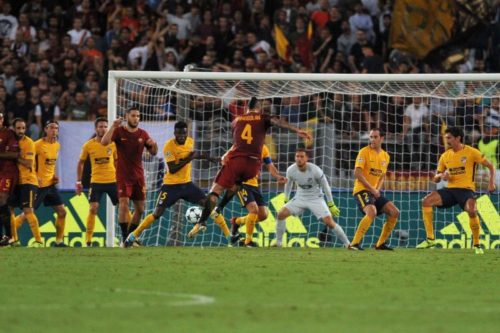 Olimpico delle grandi occasioni anche se i tagliandi staccati a malapena superano quota trentacinquemila. Di Francesco non cambia gioca la Roma pronosticata alla vigilia con Peres che vince il ballottaggio con Florenzi. Anche Simeone va sul sicuro, si blinda e mette dentro Thomas per Carrasco aggiungendo di fatti un mediano: mossa tipica vista la gara in trasferta e forse anche bocciatura per la brutta uscita dell’esterno contro il Valencia. La Roma parte col freno a mano tirato, complice anche lo spavento rimediato al primo affondo dell’Atletico: il piattone di Saul dopo tre minuti scheggia il palo esterno alla destra di Alisson. Spaventata la squadra di Di Francesco ci mette un po’ ad entrare in partita e sono gli spagnoli a fare le cose migliori in avvio. Ma nella prima mezz’ora l’unica cosa degna di nota è il rigore negato, clamoroso, dall’arbitro serbo Mazic che non fischia il fallo di mano di Vietto sulla palla messa dentro da Perotti. In Italia non ci sarebbero stati dubbi, tanto più ora con l’arrivo della Var, ma qui siamo in Champions e i parametri sono altri (ma le regole no… Boh). Mezz’ora e la gara si anima, prima Nainggolan impegna Oblak (che è anche fortunato) con una botta da fuori: bello lo schema con Kolarov. Quindi è la volta dell’Atletico: Manolas salva sulla linea ad Alisson battuto, poi lo stesso portiere brasiliano replica su Griezmann da due passi e la Roma si salva.